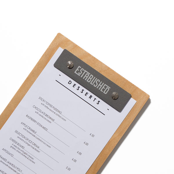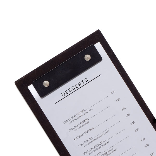 Plus de détails sur la livraisonLa planchette à menu Andorre est fabriquée à partir d’un bois reconstitué. Son système de fixation se compose d'une bande en aluminium et de deux vis . Elle est disponible dans deux coloris de bois, aux formats slim, A4 ou A5.