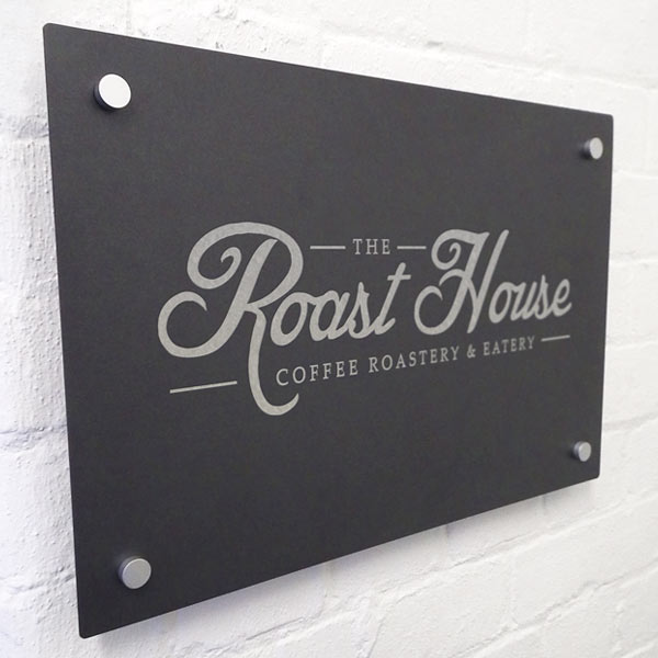 Chaque pancarte peut être gravée avec votre propre logo, texte ou motif. Elles sont disponibles dans une sélection de tailles standard. La gravure révèle la couleur naturelle du métal (bleu clair si le métal est bleu).
