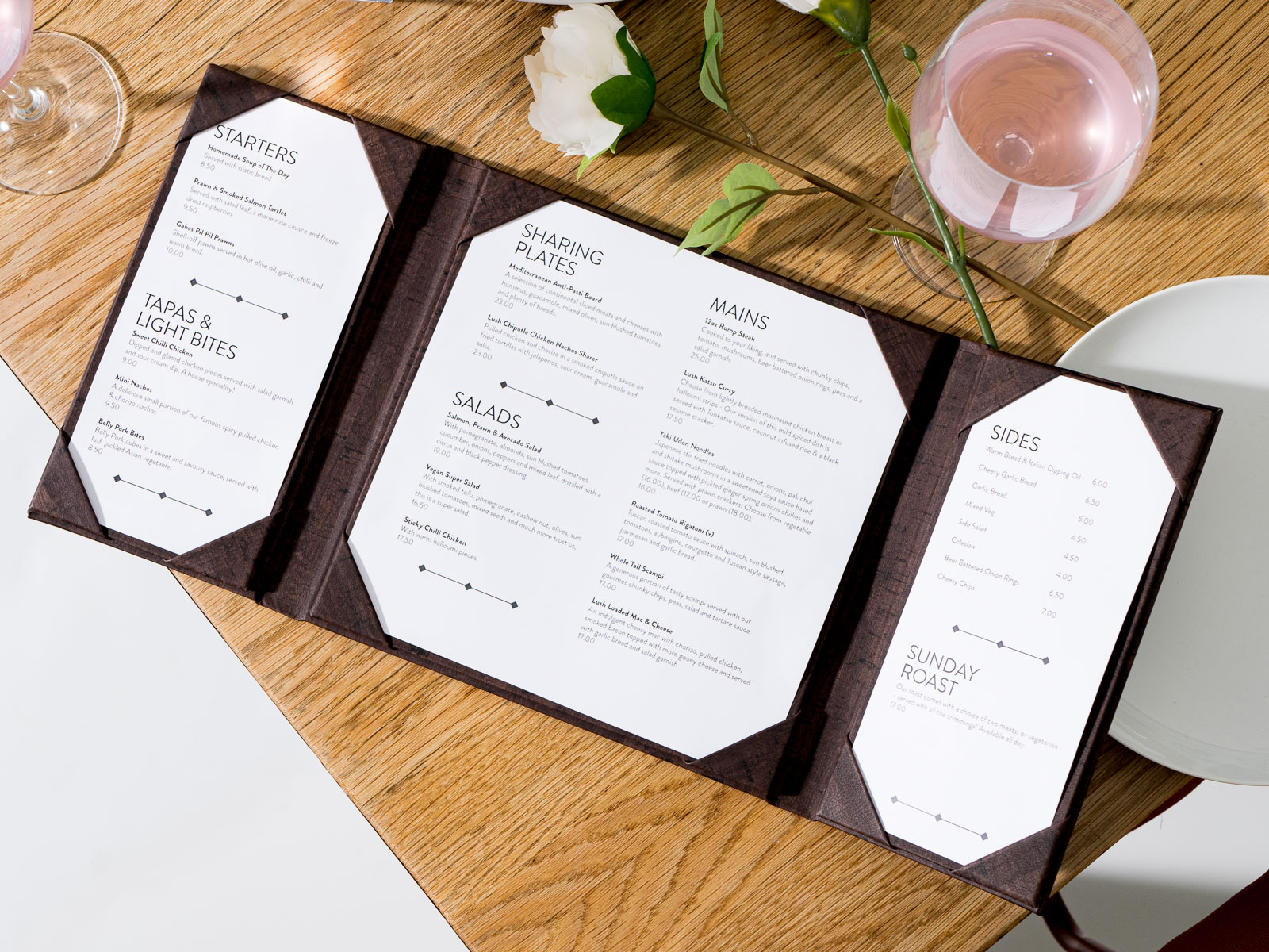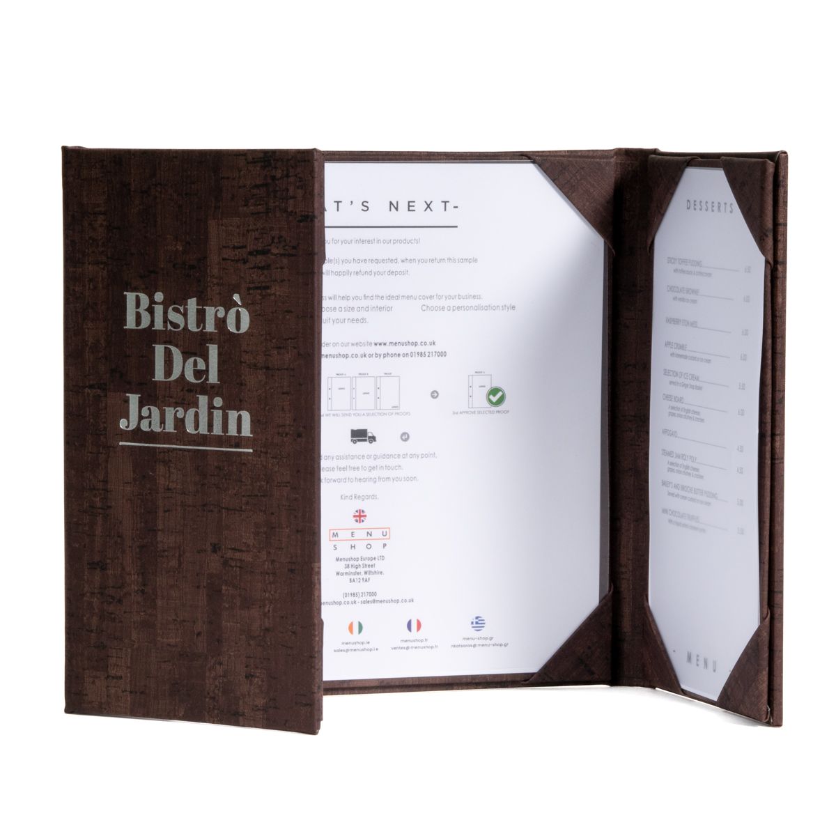 Nos menus dépliants sont parfaits pour des présentations compactes de menus courts. Vous pouvez présenter jusqu'à trois pages par protège-menu. Ils s'ouvrent de façon centrale avec des intérieurs fixes montés en coin.