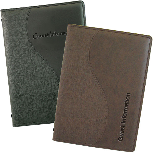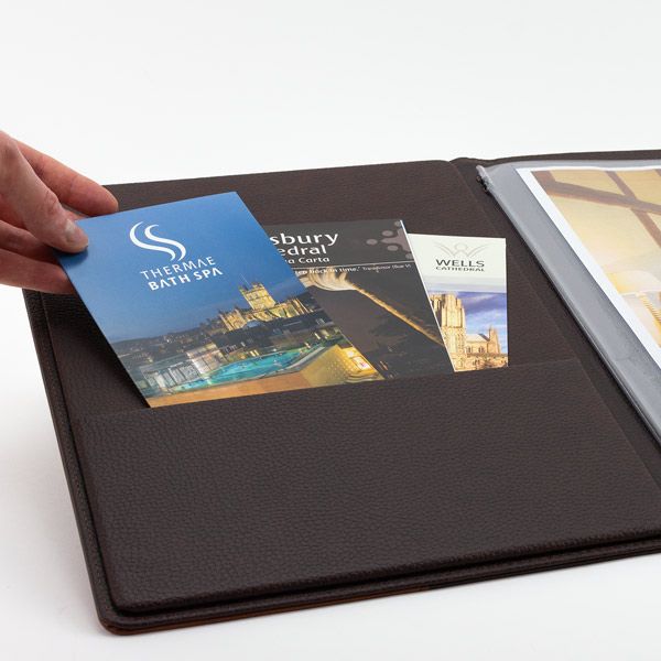 Livret d'accueil en similicuir de qualité avec pochettes internes.