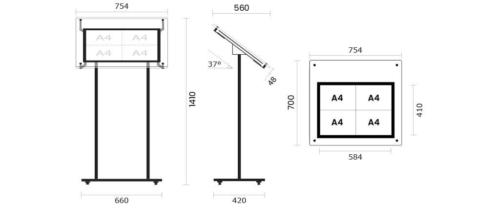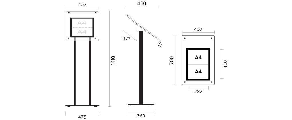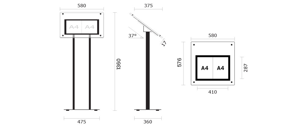 Choisissez parmi les formats A2 ou A3 disponibles en mode portrait ou paysage avec des fixations et un support avec pieds de couleur noire.