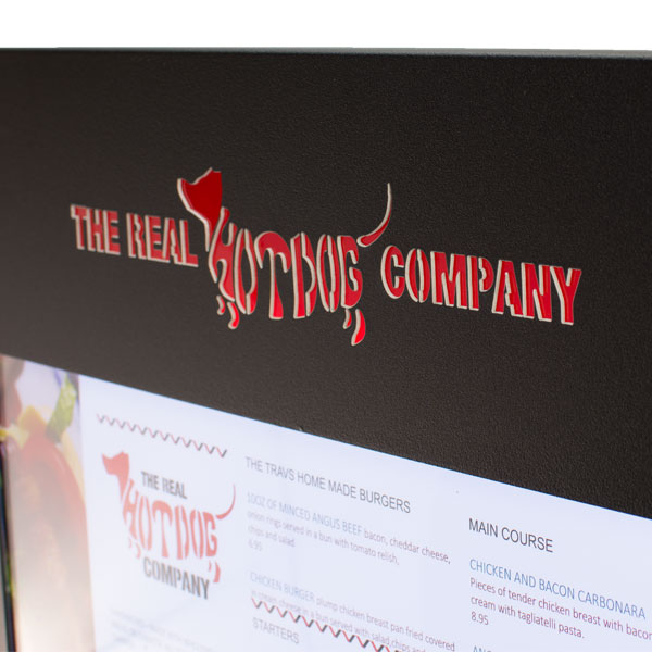 Ce style à en-tête découpé peut être personnalisé avec votre propre logo ou motif qui s'illumine en l'une des quatre couleurs de votre choix. Chaque cadre offre un éclairage lumineux pour votre logo et votre menu grâce à deux panneaux rétroéclairés à LED qui durent jusqu'à 50 000 heures. Ce présentoir présente également un profil ultra-mince de 25 mm, branché sur secteur ou avec une option batterie disponible.
