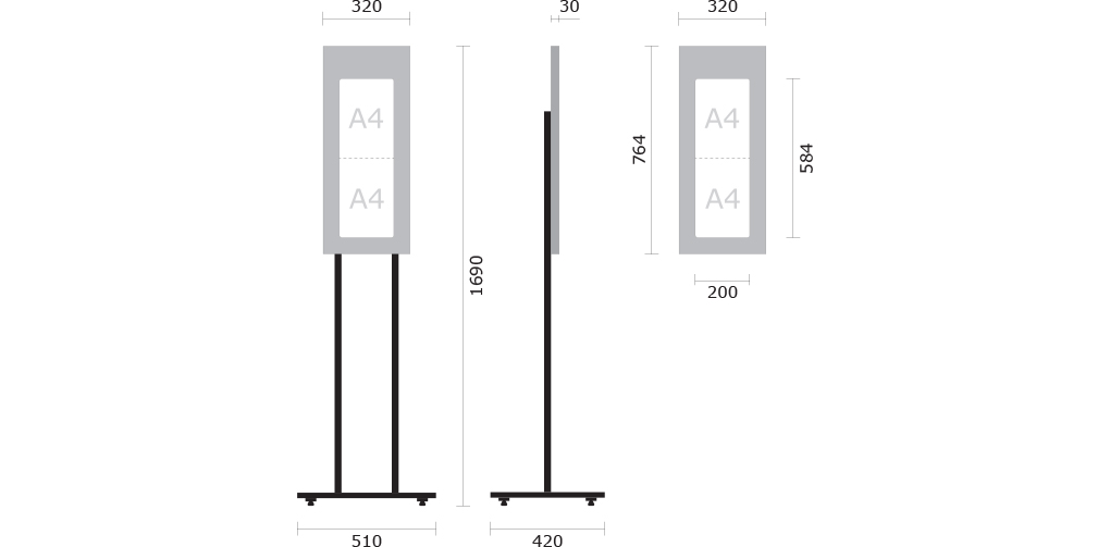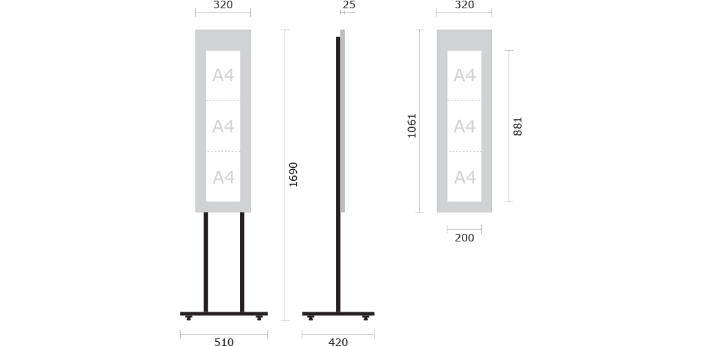 Ces supports verticaux peuvent être complétés par quatre roues verrouillables pour faciliter leur déplacement si nécessaire. Si aucune alimentation secteur n'est disponible, nous pouvons fournir une batterie rechargeable. Pour plus d'informations sur chacun des porte-menus à pied, consultez l'onglet "Options ".
