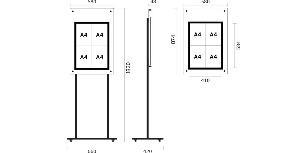Il est disponible au format A2 en mode portrait, avec des fixations et un support à pieds noirs.