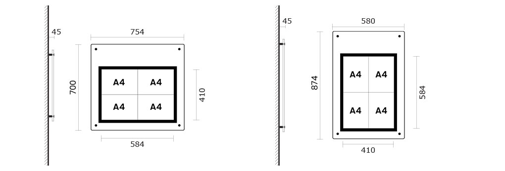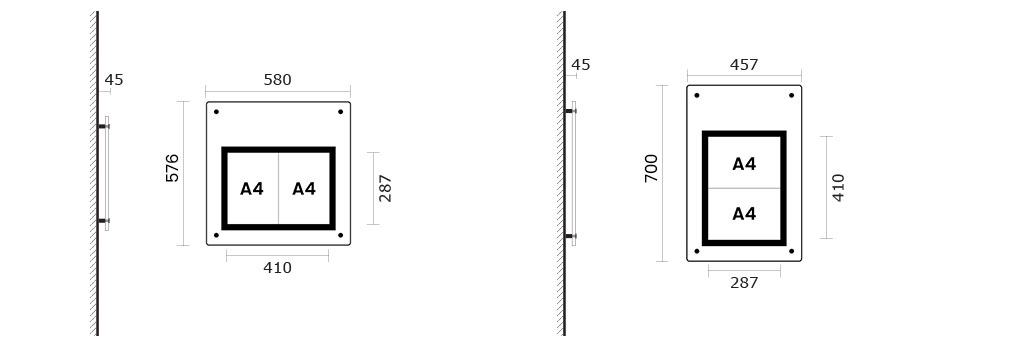 Choisissez parmi les formats A2 ou A3 disponibles en mode portrait ou paysage avec des fixations murales solides de couleur noire.