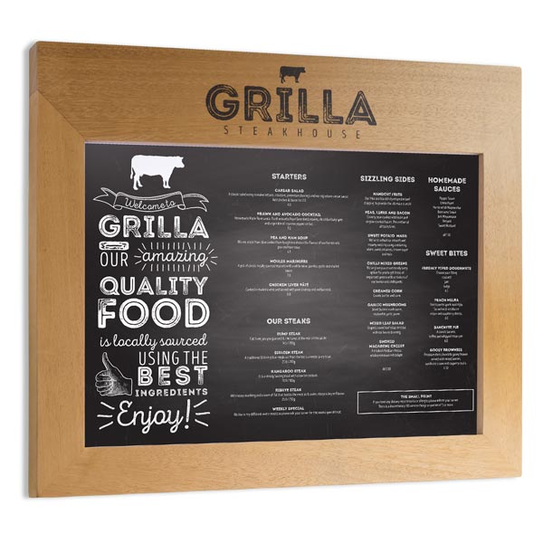Le cadre est verrouillable et les insertions se glissent très facilement en décrochant la partie avant du cadre. Le menu inséré est protégé par une vitre protectrice et éclairé de façon à être visible et agréable à lire.