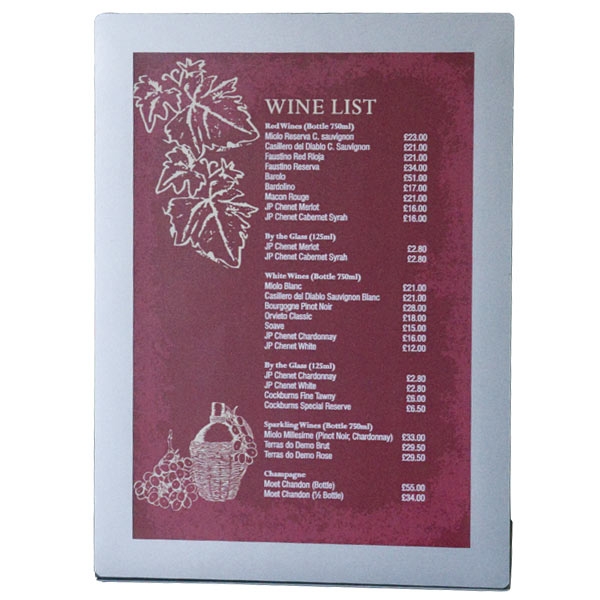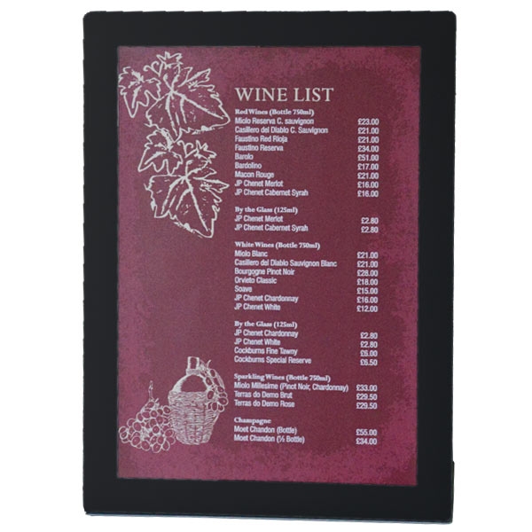 Plus de détails sur la livraisonPrésentoirs de table léger pouvant être utilisé pour des offres spéciales, des menus ou pour communiquer des informations. Chaque panneau est constitué d'un support en aluminium avec un cadre magnétique fixé à l'avant et résistant aux rayures. Votre papier imprimée est maintenue grâce au cadre magnétique qui sert également de protection de page et permet un changement de page facile. Choisissez parmi 3 tailles et 2 finitions de cadre possibles.