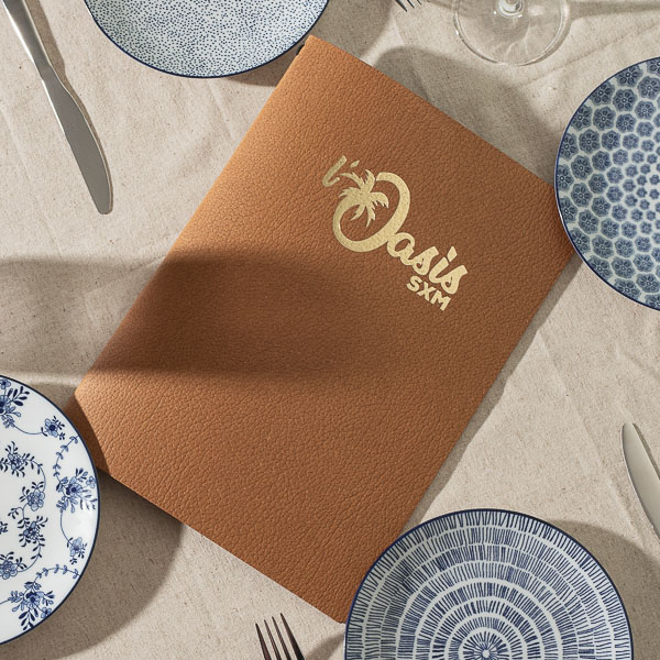Personnalisez votre couverture de menus en y ajoutant votre logo, en marquage à chaud de différentes couleurs, ou incolore. Vos encarts imprimés sont fixés solidement à l’intérieur du protège-menus, à l’aide d’un simple cordon et de pochettes transparentes.