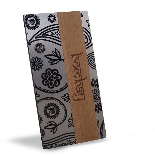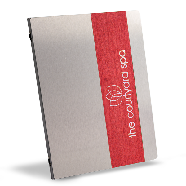 Menu original en métal de notre gamme Massilia complété par une bande effet bois avec votre logo.