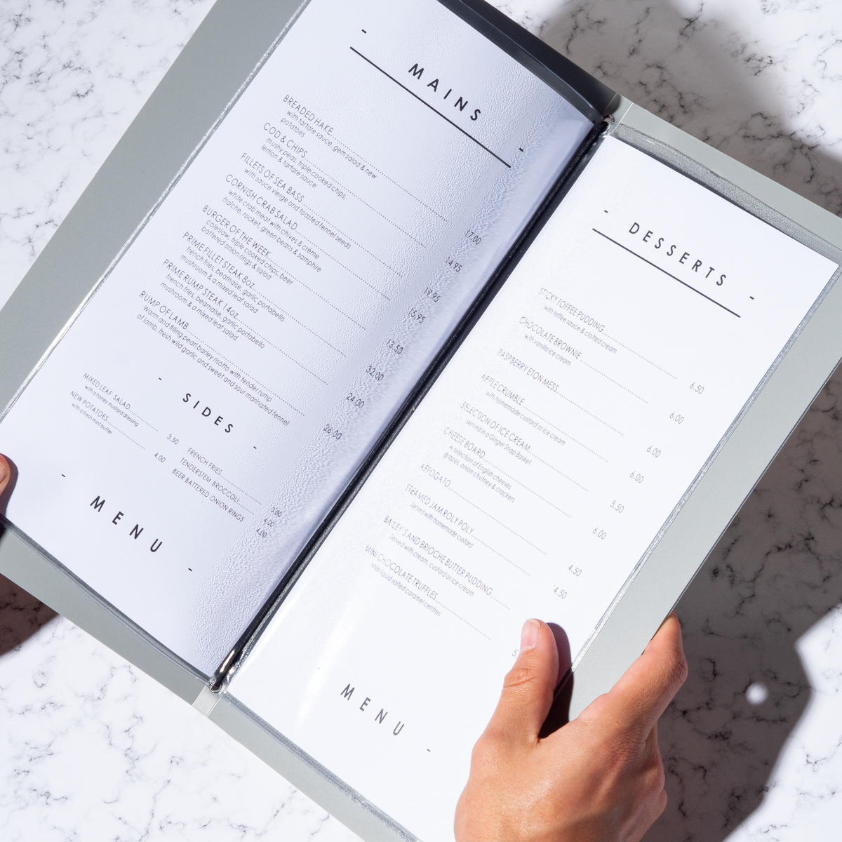 - Styled to represent your physical menus