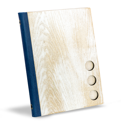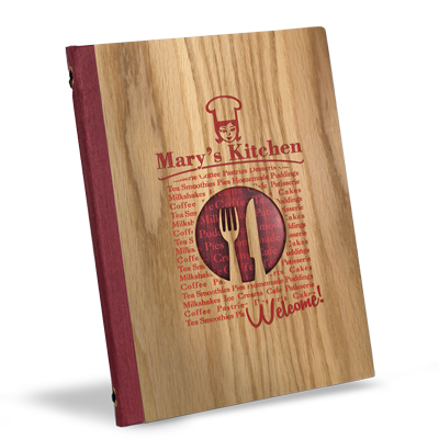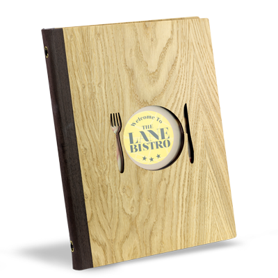 Protège-menu en bois avec découpe personnalisable disponible dans plusieurs finitions de bois.