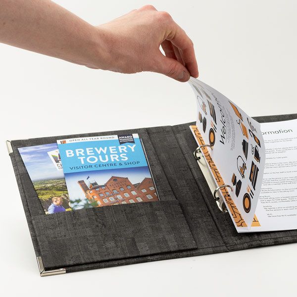 Notre fixation est polyvalente et peut contenir jusqu'à 24 pages imprimées dans des pochettes en plastique.