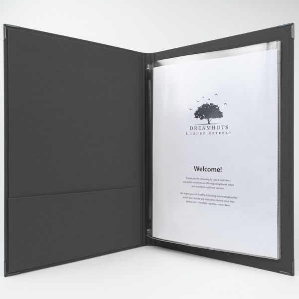 Les options de personnalisation comprennent un gaufrage sans couleur, un marquage en couleur ou bien une plaque en métal imprimé. Vous pourrez ainsi ajouter votre touche personnelle aux livrets d’accueil.