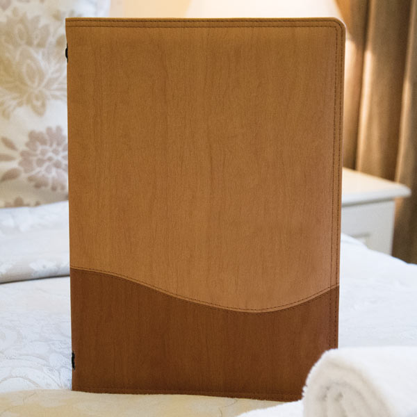 Livret d'accueil pour hôtel, bicolore avec finition cousue main